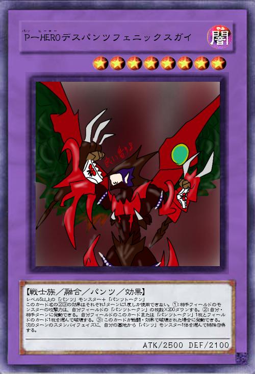 | レベル5以上の「パンツ」モンスター+「パンツトークン」 このカード名の②③の効果はそれぞれ1ターンに1度しか使用できない。①:相手フィールドのモンスターの攻撃力は、自分フィールドの「パンツトークン」の枚数×200ダウンする。②:自分・相手ターンに発動できる。自分フィールドのこのカードまたは「パンツトークン」1枚とフィールドのカード1枚を選んで破壊する。③:このカードが戦闘・効果で破壊された場合に発動できる。次のターンのスタンバイフェイズに、自分の墓地から「パンツ」モンスター1体を選んで特殊召喚する。 | |||