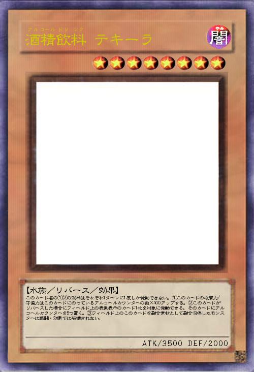 | このカード名の①②の効果はそれぞれ1ターンに1度しか発動できない。①このカードの攻撃力/守備力はこのカードにのっているアルコールカウンターの数×400アップする。②このカードがリバースした場合にフィールド上の表側表示のカード1枚を対象に発動できる。そのカードにアルコールカウンターを5つ置く。③フィールド上のこのカードを融合素材として融合召喚したモンスターは戦闘・効果では破壊されない。 | |||