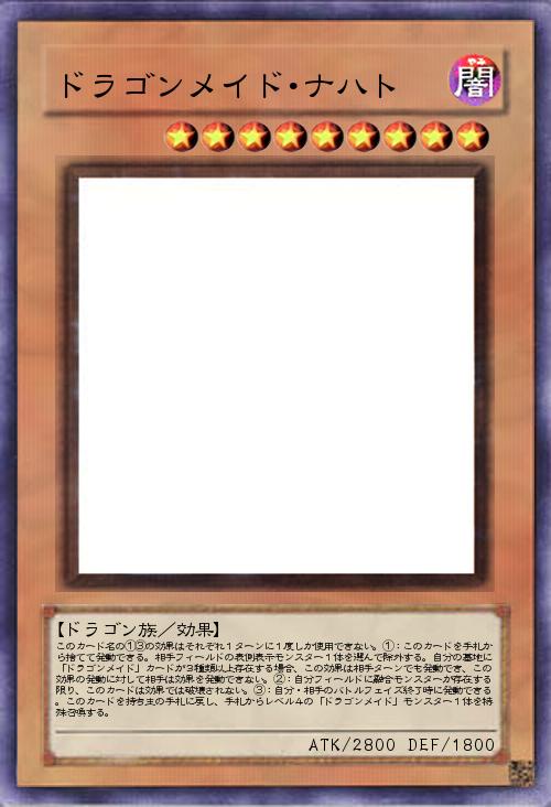 | このカード名の①③の効果はそれぞれ1ターンに1度しか使用できない。①:このカードを手札から捨てて発動できる。相手フィールドの表側表示モンスター1体を選んで除外する。自分の墓地に「ドラゴンメイド」カードが3種類以上存在する場合、この効果は相手ターンでも発動でき、この効果の発動に対して相手は効果を発動できない。②:自分フィールドに融合モンスターが存在する限り、このカードは効果では破壊されない。③:自分・相手のバトルフェイズ終了時に発動できる。このカードを持ち主の手札に戻し、手札からレベル4の「ドラゴンメイド」モンスター1体を特殊召喚する。 | |||