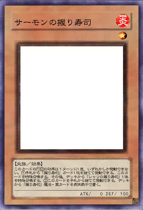 | このカードの①②の効果は1ターンに1度、いずれかしか発動できない。①手札から「握り寿司」カード1枚を捨てて発動できる。このカードを特殊召喚する。その後、デッキから「シャリの握り寿司」1体を特殊召喚する。②このカードを手札から捨てて発動できる。デッキから「握り寿司」魔法・罠カードを表側表示で置く。 | |||