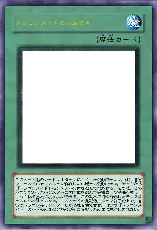 | このカード名のカードは1ターンに1枚しか発動できない。①:自分フィールドにモンスターが存在しない場合に発動できる。デッキから「ドラゴンメイド」モンスター2体を選んで除外する。その後、この効果で除外したモンスターの内1体を選んで守備表示で特殊召喚し、もう1体を墓地に戻す事ができる。この効果で特殊召喚したモンスターのレベルは5になる。このカードの発動後、ターン終了時まで、自分はドラゴン族モンスターしか特殊召喚できず、自分の「ドラゴンメイド」カードの効果の発動及びその発動した効果は無効化されない。 | |||