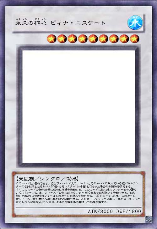 | このカードはS召喚できず、自分フィールド上の、レベルとそのカードに乗っている枢心珠カウンターの合計が9となるレベル5「枢心」モンスター1体を墓地に送った場合のみ特殊召喚できる。 (1):このカードが特殊召喚に成功した場合発動する。このカードに枢心珠カウンターを4つ置く。(2):1ターンに1度、フィールドの枢心珠カウンターを10個まで取り除いて発動できる。取り除いた数2つにつき1枚フィールドのカードを選んで除外する。(3):1ターンに1度、このカードがフィールドから墓地へ送られた場合発動できる。このカードをデッキに戻し、エクストラデッキからレベル7の「枢心」モンスター1体を召喚条件を無視して特殊召喚する。 | |||