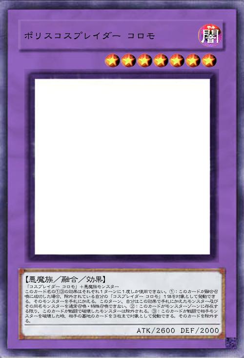 | 「コスプレイダー コロモ」+悪魔族モンスター このカード名の①③の効果はそれぞれ1ターンに1度しか使用できない。①:このカードが融合召喚に成功した場合、除外されている自分の「コスプレイダー コロモ」1体を対象として発動できる。そのモンスターを手札に加える。このターン、自分はこの効果で手札に加えたモンスター及びその同名モンスターを通常召喚・特殊召喚できない。②:このカードがモンスターゾーンに存在する限り、このカードが戦闘で破壊したモンスターは除外される。③:このカードが戦闘で相手モンスターを破壊した時、相手の墓地のカードを3枚まで対象として発動できる。そのカードを除外する。 | |||
