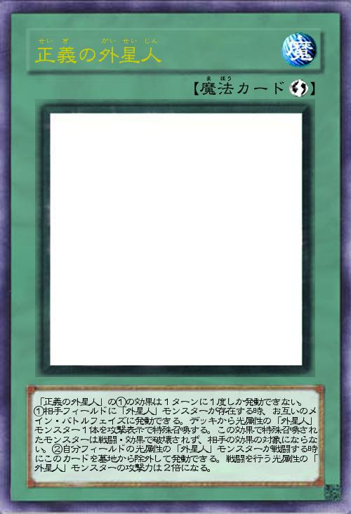 | 「正義の外星人」の①の効果は1ターンに1度しか発動できない。 ①相手フィールドに「外星人」モンスターが存在する時、お互いのメイン・バトルフェイズに発動できる。デッキから光属性の「外星人」モンスター1体を攻撃表示で特殊召喚する。この効果で特殊召喚されたモンスターは戦闘・効果で破壊されず、相手の効果の対象にならない。②自分フィールドの光属性の「外星人」モンスターが戦闘する時にこのカードを墓地から除外して発動できる。戦闘を行う光属性の「外星人」モンスターの攻撃力は2倍になる。 | |||