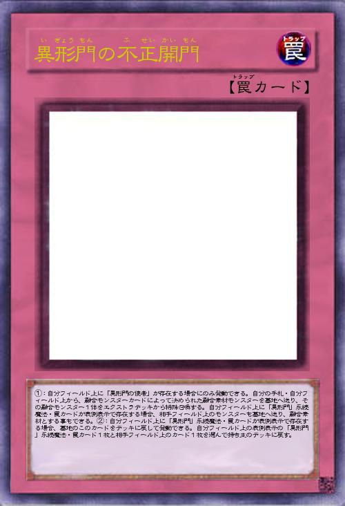 | ①:自分フィールド上に「異形門の使者」が存在する場合にのみ発動できる。自分の手札・自分フィールド上から、融合モンスターカードによって決められた融合素材モンスターを墓地へ送り、その融合モンスター1体をエクストラデッキから特殊召喚する。自分フィールド上に「異形門」永続魔法・罠カードが表側表示で存在する場合、相手フィールド上のモンスターも墓地へ送り、融合素材とする事もできる。②:自分フィールド上に「異形門」永続魔法・罠カードが表側表示で存在する場合、墓地のこのカードをデッキに戻して発動できる。自分フィールド上の表側表示の「異形門」永続魔法・罠カード1枚と相手フィールド上のカード1枚を選んで持ち主のデッキに戻す。 | |||