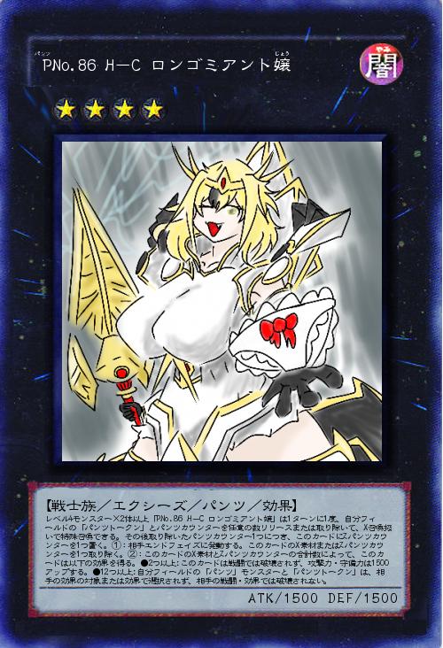 | レベル4モンスター×2体以上「PNo.86 H-C ロンゴミアント嬢」は1ターンに1度、自分フィールドの「パンツトークン」とパンツカウンターを任意の数リリースまたは取り除いて、X召喚扱いで特殊召喚できる。その後取り除いたパンツカウンター1つにつき、このカードにZパンツカウンターを1つ置く。①:相手エンドフェイズに発動する。このカードのX素材またはZパンツカウンターを1つ取り除く。②:このカードのX素材とZパンツカウンターの合計数によって、このカードは以下の効果を得る。●2つ以上:このカードは戦闘では破壊されず、攻撃力・守備力は1500アップする。●12つ以上:自分フィールドの「パンツ」モンスターと「パンツトークン」は、相手の効果の対象または効果で選択されず、相手の戦闘・効果では破壊されない。 | |||