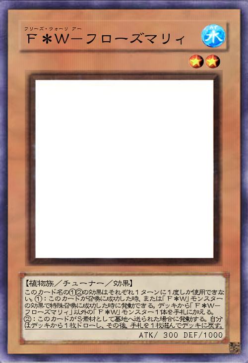 | このカード名の①②の効果はそれぞれ1ターンに1度しか使用できない。①:このカードが召喚に成功した時、または「F*W」モンスターの効果で特殊召喚に成功した時に発動できる。デッキから「F*W-フローズマリィ」以外の「F*W」モンスター1体を手札に加える。 ②:このカードがS素材として墓地へ送られた場合に発動する。自分はデッキから1枚ドローし、その後、手札を1枚選んでデッキに戻す。 | |||