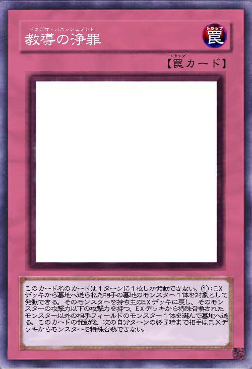 | このカード名のカードは1ターンに1枚しか発動できない。①:EXデッキから墓地へ送られた相手の墓地のモンスター1体を対象として発動できる。そのモンスターを持ち主のEXデッキに戻し、そのモンスターの攻撃力以下の攻撃力を持つ、EXデッキから特殊召喚されたモンスター以外の相手フィールドのモンスター1体を選んで墓地へ送る。このカードの発動後、次の自分ターンの終了時まで相手はEXデッキからモンスターを特殊召喚できない。 | |||
