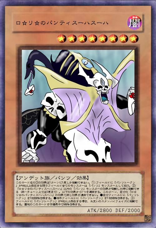 | このカード名の③の効果は1ターンに1度しか発動できない。①:フィールドに「パンツトークン」が4枚以上存在する限りフィールド全てのモンスターは「パンツ」モンスターとして扱う。②:「ロ☆リ☆のパンティスーハスーハ」以外の「パンツ」モンスターの効果が発動した時に発動できる(同一チェーン上では1度まで)。以下の効果から1つを適用する。このターン、自分の「ロ☆リ☆のパンティスーハスーハ」の効果で同じ効果を適用できない。●自分フィールドに「パンツトークン」を1枚特殊召喚する。●相手フィールドに「パンツトークン」を1枚特殊召喚する。③:フィールドに「パンツトークン」が4枚以上存在する場合、お互いのスタンバイフェイズに発動できる。墓地のこのカードを守備表示で特殊召喚する。 | |||