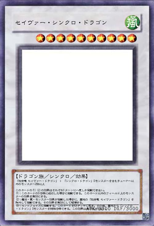 | 「救世竜 セイヴァー・ドラゴン」 + 「シンクロ・ドラゴン」Sモンスターを含むチューナー以外のモンスター2体以上 このカードの(1)(2)の効果はそれぞれ1ターンに一度しか発動できない。 (1):このカードのS召喚に成功した場合に発動できる。このカード以外のフィールド上のモンスターの効果を無効にする。 (2):魔法・罠・モンスター効果が発動した場合に、墓地の「救世竜 セイヴァー・ドラゴン」を除外して発動できる。その効果を無効にして破壊する。 (3):エンドフェイズに発動する。このカードをEXデッキに戻す。その後、墓地から「シンクロ・ドラゴン」Sモンスターを特殊召喚できる。この効果は無効化されない。 | |||