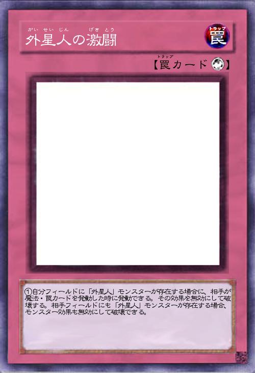| ①自分フィールドに「外星人」モンスターが存在する場合に、相手が魔法・罠カードを発動した時に発動できる。その効果を無効にして破壊する。相手フィールドにも「外星人」モンスターが存在する場合、モンスター効果も無効にして破壊できる。 | |||