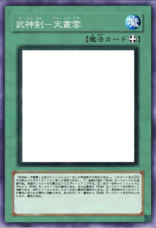 | 「武神剣-天叢雲」は自分フィールド上に1枚しか表側表示で存在できない。このカード名の②③の効果はそれぞれ1ターンに1度しか使用できない。①:獣戦士族の「武神」モンスターにのみ装備可能。装備モンスターの攻撃力は700ポイントアップする。②:自分・相手メインフェイズに手札から「武神」モンスター1体を墓地に送る、または墓地の「武神」モンスター1体を除外して発動できる。相手フィールドのモンスターを全て裏側守備表示にする。③:表側表示のこのカードが墓地に送られた場合に発動できる。自分のデッキ・墓地から「武神」モンスター1体を手札に加えるか、墓地に送る。 | |||