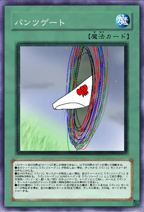 | このカード名の効果は1ターンに1度しか使用できない。以下の効果から1つを選んで発動する。 ●自分フィールドに「パンツトークン」が存在しない場合、デッキから「パンツ」モンスターを1枚手札に加える。 ●自分の手札に「パンツ」モンスターが存在しない場合、自分フィールドに「パンツトークン」を2枚特殊召喚する。「パンツトークン」以外のトークンを「パンツトークン」として扱う場合、(天使族・パンツ・光・星1・攻/守0)のチューナーで、トークンとして扱い、ルール上「パンツ」モンスター以外のアドバンス召喚・特殊召喚のための素材にできない。 ●自分の墓地に「パンツトークン」のカード名が記された魔法・罠カードまたは「パンツ」モンスターが存在する場合、自分の墓地のカードを3枚まで選び、デッキに戻す。その後、カードを1枚ドローする。 | |||