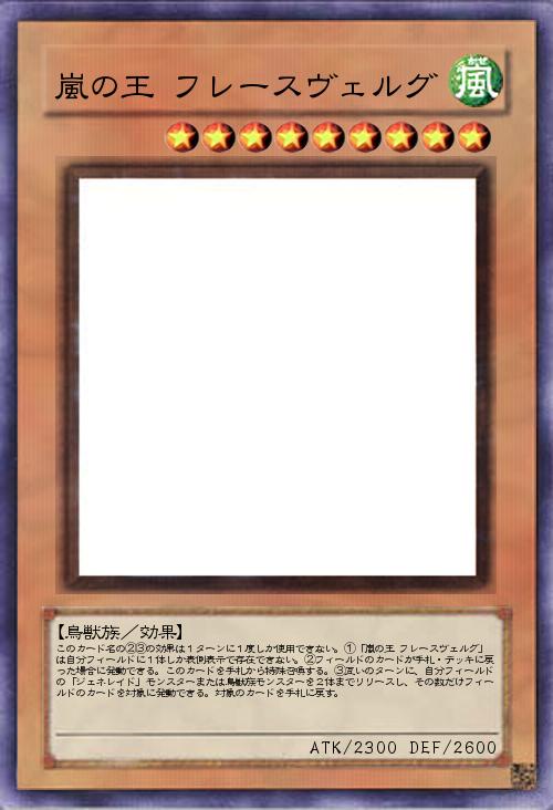 | このカード名の②③の効果は1ターンに1度しか使用できない。①「嵐の王 フレースヴェルグ」は自分フィールドに1体しか表側表示で存在できない。②フィールドのカードが手札・デッキに戻った場合に発動できる。このカードを手札から特殊召喚する。③互いのターンに、自分フィールドの「ジェネレイド」モンスターまたは鳥獣族モンスターを2体までリリースし、その数だけフィールドのカードを対象に発動できる。対象のカードを手札に戻す。 | |||