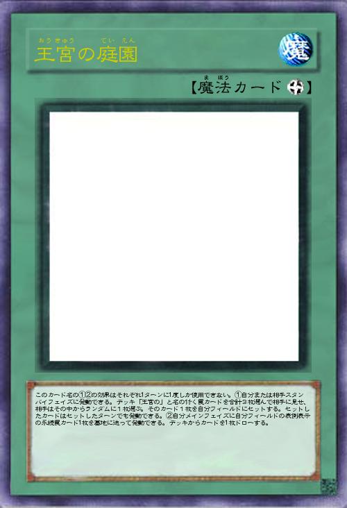 | このカード名の①②の効果はそれぞれ1ターンに1度しか使用できない。①自分または相手スタンバイフェイズに発動できる。デッキ「王宮の」と名の付く罠カードを合計3枚選んで相手に見せ、相手はその中からランダムに1枚選ぶ。そのカード1枚を自分フィールドにセットする。セットしたカードはセットしたターンでも発動できる。②自分メインフェイズに自分フィールドの表側表示の永続罠カード1枚を墓地に送って発動できる。デッキからカードを1枚ドローする。 | |||