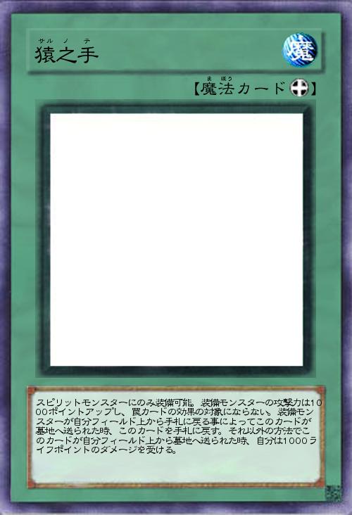 「本日最後の投稿です。スピリット専用の装備魔法。猿の手をイメージして、強力なメリットと強烈なデメリットを設けてみました。阿修羅や麒麟に使うといい感じです(`・∀・´)b」(2012-07-17 15:27)