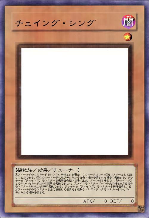 | ①フィールドのこのカードをシンクロ素材とする場合、このカードはレベル2モンスターとして扱うことができる。②このカードが手札及びデッキから召喚・特殊召喚された場合に発動する。デッキから「チェイング」モンスターを通常召喚扱いで場に出す。ターン終了時まで、「チェイング」と名のついたカード以外の効果を発動できない。③メインモンスターゾーンの元の持ち主が自分のモンスターが4体以上の時に発動できる。デッキから「チェイング」モンスターを特殊召喚し、自分フィールドのモンスターを全て使用して召喚できる融合・S・X・リンクモンスターを1体、Exデッキから特殊召喚する。 | |||