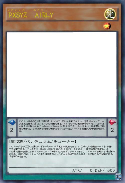 | このカード名の①②の効果はいずれか1ターンに1度しか使用できない。①手札から魔法カードを1枚捨てて発動できる。デッキから「PXSYZ AIRLY」以外の「PXSYZ」モンスター1体を特殊召喚する。この効果で特殊召喚したモンスターはリンク素材にはできずリリースできず、フィールドを離れる場合除外される。②自分エンドフェイズまたは相手のバトルフェイズに手札のこのカードを除外して発動できる。LPを500回復する。 | |||