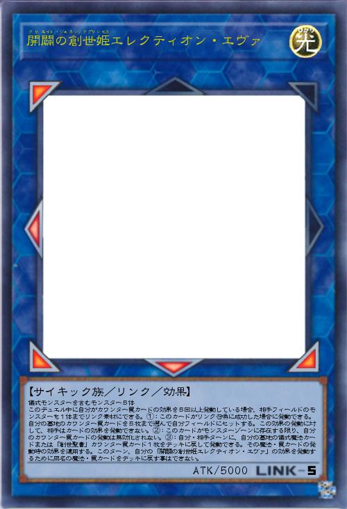 | 儀式モンスターを含むモンスター5体 このデュエル中に自分がカウンター罠カードの効果を5回以上発動している場合、相手フィールドのモンスターも1体までリンク素材にできる。①:このカードがリンク召喚に成功した場合に発動できる。自分の墓地のカウンター罠カードを5枚まで選んで自分フィールドにセットする。この効果の発動に対して、相手はカードの効果を発動できない。②:このカードがモンスターゾーンに存在する限り、自分のカウンター罠カードの発動は無効化されない。③:自分・相手ターンに、自分の墓地の儀式魔法カードまたは「創世聖書」カウンター罠カード1枚をデッキに戻して発動できる。その魔法・罠カードの発動時の効果を適用する。このターン、自分の「開闢の創世姫エレクティオン・エヴァ」の効果を発動するために同名の魔法・罠カードをデッキに戻す事はできない。 | |||