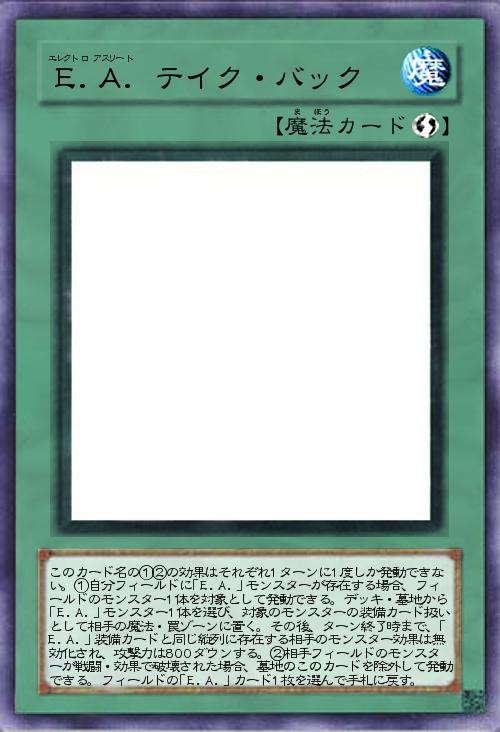 | このカード名の①②の効果はそれぞれ1ターンに1度しか発動できない。①自分フィールドに「E.A.」モンスターが存在する場合、フィールドのモンスター1体を対象として発動できる。デッキ・墓地から「E.A.」モンスター1体を選び、対象のモンスターの装備カード扱いとして相手の魔法・罠ゾーンに置く。その後、ターン終了時まで、「E.A.」装備カードと同じ縦列に存在する相手のモンスター効果は無効化され、攻撃力は800ダウンする。②相手フィールドのモンスターが戦闘・効果で破壊された場合、墓地のこのカードを除外して発動できる。フィールドの「E.A.」カード1枚を選んで手札に戻す。 | |||