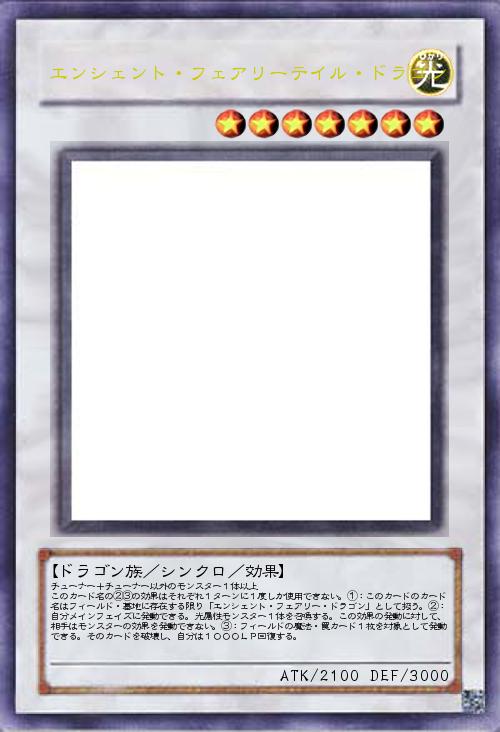 | チューナー+チューナー以外のモンスター1体以上 このカード名の②③の効果はそれぞれ1ターンに1度しか使用できない。①:このカードのカード名はフィールド・墓地に存在する限り「エンシェント・フェアリー・ドラゴン」として扱う。②:自分メインフェイズに発動できる。光属性モンスター1体を召喚する。この効果の発動に対して、相手はモンスターの効果を発動できない。③:フィールドの魔法・罠カード1枚を対象として発動できる。そのカードを破壊し、自分は1000LP回復する。 | |||