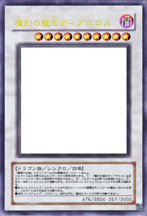 | 「闇黒の従者」+チューナー以外の闇属性モンスター1体以上 このカードはS召喚でのみEXデッキから特殊召喚できる。①:「魔刻の龍王ディアボロス」は自分フィールドに1体しか表側表示で存在できない。②:このカードは効果では破壊されない。③:自分・相手バトルフェイズに発動できる。それぞれのバトルフェイズによって以下の効果を適用する。 ●自分バトルフェイズ:このカード以外の自分フィールドの闇属性モンスターが墓地へ送られる度に、このカードはその数まで攻撃できる。 ●相手バトルフェイズ:このターン、相手は手札・墓地のカードの効果を発動できない。 | |||