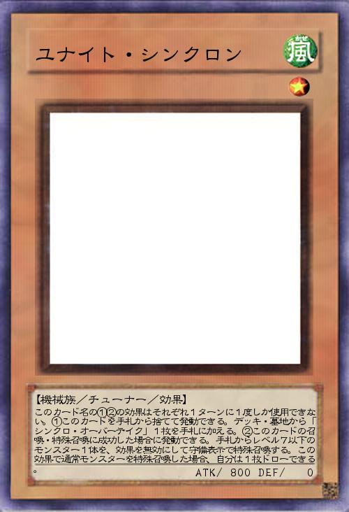| このカード名の①②の効果はそれぞれ1ターンに1度しか使用できない。①このカードを手札から捨てて発動できる。デッキ・墓地から「シンクロ・オーバーテイク」1枚を手札に加える。②このカードの召喚・特殊召喚に成功した場合に発動できる。手札からレベル7以下のモンスター1体を、効果を無効にして守備表示で特殊召喚する。この効果で通常モンスターを特殊召喚した場合、自分は1枚ドローできる。 | |||