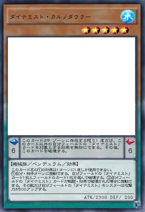 | このカード名の①の効果は1ターンに1度しか使用できない。 ①自分・相手ターンに発動できる。自分フィールドの「ダイナミスト」カード1枚とフィールドのカード1枚を選んで破壊する。②自分フィールドの「ダイナミスト」カードが戦闘・効果で破壊された場合に発動できる。その数だけ自分フィールドの「ダイナミスト」モンスターは攻撃力が300アップする。 | |||