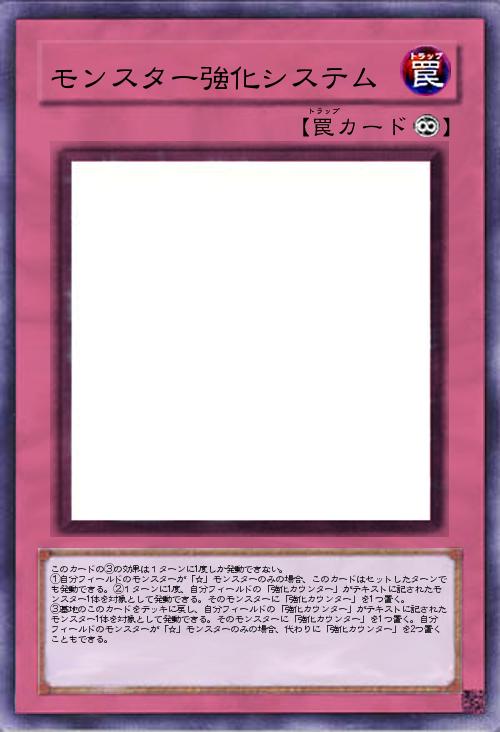 | このカードの③の効果は1ターンに1度しか発動できない。 ①自分フィールドのモンスターが「☆」モンスターのみの場合、このカードはセットしたターンでも発動できる。②1ターンに1度、自分フィールドの「強化カウンター」がテキストに記されたモンスター1体を対象として発動できる。そのモンスターに「強化カウンター」を1つ置く。 ③墓地のこのカードをデッキに戻し、自分フィールドの「強化カウンター」がテキストに記されたモンスター1体を対象として発動できる。そのモンスターに「強化カウンター」を1つ置く。自分フィールドのモンスターが「☆」モンスターのみの場合、代わりに「強化カウンター」を2つ置くこともできる。 | |||