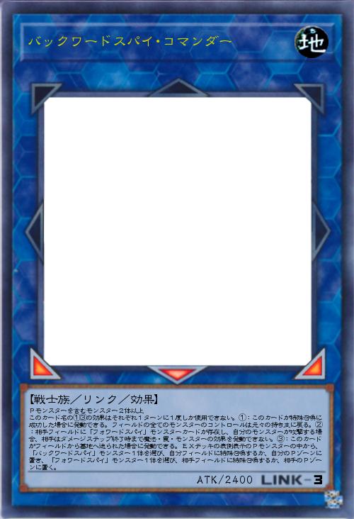 | Pモンスターを含むモンスター2体以上 このカード名の①③の効果はそれぞれ1ターンに1度しか使用できない。①:このカードが特殊召喚に成功した場合に発動できる。フィールドの全てのモンスターのコントロールは元々の持ち主に戻る。②:相手フィールドに「フォワードスパイ」モンスターカードが存在し、自分のモンスターが攻撃する場合、相手はダメージステップ終了時まで魔法・罠・モンスターの効果を発動できない。③:このカードがフィールドから墓地へ送られた場合に発動できる。EXデッキの表側表示のPモンスターの中から、「バックワードスパイ」モンスター1体を選び、自分フィールドに特殊召喚するか、自分のPゾーンに置き、「フォワードスパイ」モンスター1体を選び、相手フィールドに特殊召喚するか、相手のPゾーンに置く。 | |||