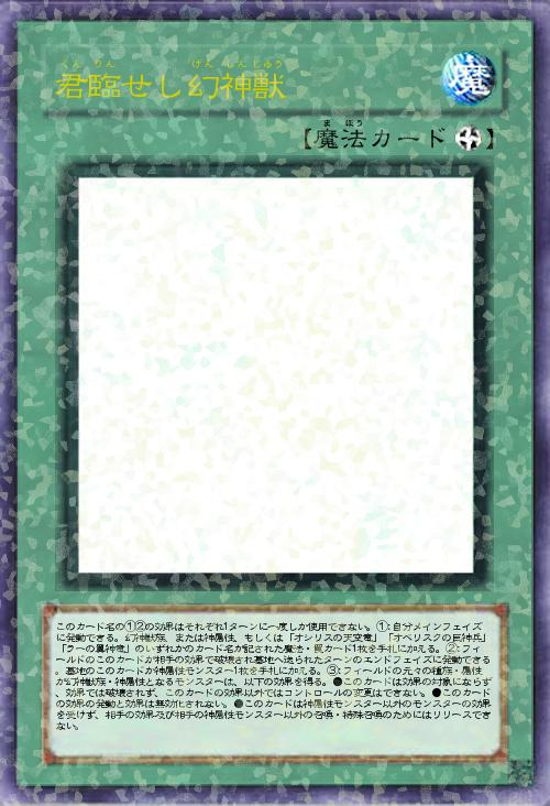 | このカード名の①②の効果はそれぞれ1ターンに一度しか使用できない。①:自分メインフェイズに発動できる。幻神獣族、または神属性、もしくは「オシリスの天空竜」「オベリスクの巨神兵」「ラーの翼神竜」のいずれかのカード名が記された魔法・罠カード1枚を手札に加える。②:フィールドのこのカードが相手の効果で破壊され墓地へ送られたターンのエンドフェイズに発動できる。墓地のこのカードか神属性モンスター1枚を手札に加える。③:フィールドの元々の種族・属性が幻神獣族・神属性となるモンスターは、以下の効果を得る。●このカードは効果の対象にならず、効果では破壊されず、このカードの効果以外ではコントロールの変更はできない。●このカードの効果の発動と効果は無効化されない。●このカードは神属性モンスター以外のモンスターの効果を受けず、相手の効果及び相手の神属性モンスター以外の召喚・特殊召喚のためにはリリースできない。 | |||