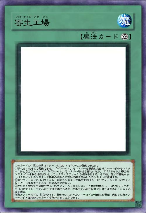 | このカードの①③の効果は1ターンに1度、いずれかしか発動できない。 ①手札を1枚捨てて発動できる。「パラサイト」モンスターを装備した自分フィールドのモンスター1体と自分フィールドの「パラサイト」モンスター1体をを墓地へ送り、「パラサイト」融合モンスター1体を融合召喚扱いとしてエクストラデッキから特殊召喚する。その後、自分の墓地から「パラサイト」モンスターを任意の枚数この効果で融合召喚したモンスターに装備する。 ②自分フィールドに「パラサイト」融合モンスターが存在する限り、自分フィールドの「パラサイト」カードは相手モンスターの効果を受けない。 ③手札を1枚捨てて発動できる。相手フィールドのモンスター1体を対象とし、 自分のデッキから「パラサイト」モンスター1体を墓地へ送り、対象モンスターのコントロールをエンドフェイズまで得る。 ④自分フィールドの「パラサイト」融合モンスターがフィールドから離 | |||