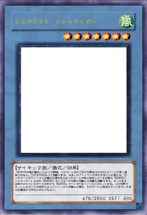 | 「ECHOSE共鳴の儀式」によって降臨。このカード名の①②の効果はそれぞれ1ターンに1度し使用できない。①LPを1000払って発動できる。お互いのプレイヤーの手札を全て入れ替える。②このカードがフィールドを離れた場合またはこのカードが既に存在している状態で「ECHOSEシンセサイザー」以外の「ECHOSE」モンスターの効果が発動した発動に発動できる。デッキまたは除外されているカードの中から「ECHOSE」カードを1枚フィールドにセットする。この効果でセットしたカードが相手によってフィールドを離れた場合、そのカードと同名のカードをデッキまたは墓地から手札に加えてもよい。 | |||