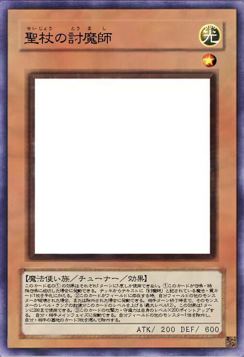 | このカード名の①➃の効果はそれぞれ1ターンに1度しか使用できない。①このカードが召喚・特殊召喚に成功した場合に発動できる。デッキからテキストに「討魔師」と記されている魔法・罠カード1枚を手札に加える。②このカードがフィールドに存在する時、自分フィールドの他のモンスターが破壊された場合、または除外された場合に発動できる。相手ターン終了時まで、そのモンスターのレベル・ランクの数値分このカードのレベルを上げる(最大レベル12)。この効果は1ターンに2回まで使用できる。③このカードの攻撃力・守備力は自身のレベル×200ポイントアップする。➃自分・相手メインフェイズに発動できる。自分フィールドの他のモンスター1体を除外し、自分・相手の墓地のカード3枚を選んで除外する。 | |||