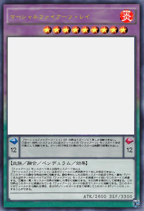 | 「ファイアーツ」モンスター1体+炎族モンスター1体以上 「マーシャルファイアーツ・レイ」は自分フィールドに表側表示で1枚しか存在できない。 ①このカードの融合召喚成功時に発動する。融合素材とした炎族モンスターの数まで手札・墓地・PゾーンまたはEXデッキのレベル7以下の「ファイアーツ」モンスターを装備カード扱いでこのカードに装備する。②魔法・罠・モンスター効果が発動した場合に発動できる。その効果を無効にして破壊する。この効果はこのカードに装備されている「ファイアーツ」カードの数まで1ターンに発動できる。③このカードがフィールドから離れる場合、自分のPゾーンのカードを全て破壊してこのカードをPゾーンにセットすることができる。 | |||