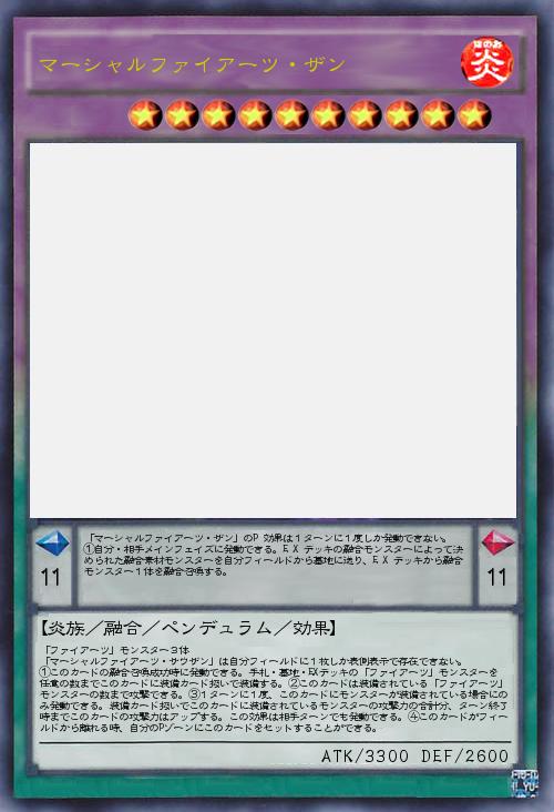 | 「マーシャルファイアーツ・ザン」のP効果は1ターンに1度しか発動できない。 ①自分・相手メインフェイズに発動できる。EXデッキの融合モンスターによって決められた融合素材モンスターを自分フィールドから墓地に送り、EXデッキから融合モンスター1体を融合召喚する。 | |||