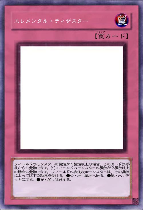 | フィールドのモンスターの属性が4属性以上の場合、このカードは手札からも発動できる。①フィールドのモンスターの属性が2属性以上の場合に発動できる。フィールドの表側表示モンスターは、その属性によって以下の効果を受ける。●炎・地:墓地へ送る。●風・水:デッキに戻す。●光・闇:除外する。 | |||