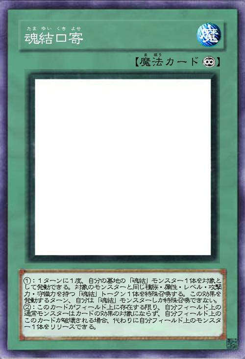| ①:1ターンに1度、自分の墓地の「魂結」モンスター1体を対象として発動できる。対象のモンスターと同じ種族・属性・レベル・攻撃力・守備力を持つ「魂結」トークン1体を特殊召喚する。この効果を発動するターン、自分は「魂結」モンスターしか特殊召喚できない。②:このカードがフィールド上に存在する限り、自分フィールド上の通常モンスターはカードの効果の対象にならず、自分フィールド上のこのカードが破壊される場合、代わりに自分フィールド上のモンスター1体をリリースできる。 | |||