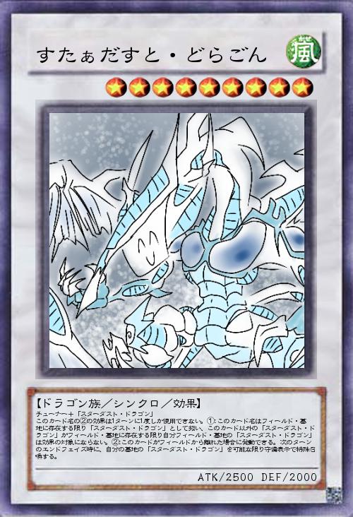 | チューナー+「スターダスト・ドラゴン」 このカード名の②の効果は1ターンに1度しか使用できない。①:このカード名はフィールド・墓地に存在する限り「スターダスト・ドラゴン」として扱い、このカード以外の「スターダスト・ドラゴン」がフィールド・墓地に存在する限り自分フィールド・墓地の「スターダスト・ドラゴン」は効果の対象にならない。②:このカードがフィールドから離れた場合に発動できる。次のターンのエンドフェイズ時に、自分の墓地の「スターダスト・ドラゴン」を可能な限り守備表示で特殊召喚する。 | |||