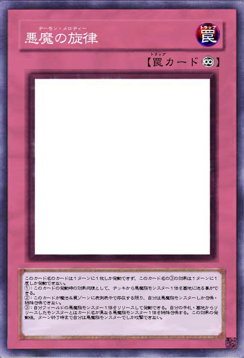 | このカード名のカードは1ターンに1枚しか発動できず、このカード名の③の効果は1ターンに1度しか発動できない。 ①:このカードの発動時の効果処理として、デッキから悪魔族モンスター1体を墓地に送る事ができる。 ②:このカードが魔法&罠ゾーンに表側表示で存在する限り、自分は悪魔族モンスターしか召喚・特殊召喚できない。 ③:自分フィールドの悪魔族モンスター1体をリリースして発動できる。自分の手札・墓地からリリースしたモンスターとはカード名が異なる悪魔族モンスター1体を特殊召喚する。この効果の発動後、ターン終了時まで自分は悪魔族モンスターでしか攻撃できない。 | |||