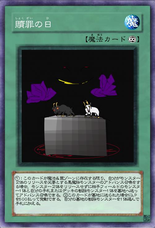 「悪魔ということでヨム・キプールをモチーフとした効果のカードにしました。ユダヤ教の祭日の一つで羊を1頭は神への生贄に1頭は悪魔アザゼルに引き渡すとされていてそれにちなんだ効果にしています。②の効果は大祭司が断食を行い自らを苦める所をLPを払う所に当てはめました。悪魔に引き渡す所の再現が難しかったですが。一度墓地に送ってから②の効果で回収することによってそれを再現してみました。イラストは全く情景が浮かばなかったので適当です。」(2022-08-24 01:26)
