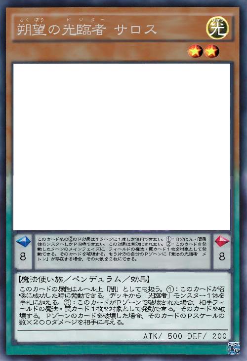 | このカードの属性はルール上「闇」としても扱う。①:このカードが召喚に成功した時に発動できる。デッキから「光臨者」モンスター1体を手札に加える。②:このカードがPゾーンで破壊された場合、相手フィールドの魔法・罠カード1枚を対象として発動できる。そのカードを破壊する。Pゾーンのカードを破壊した場合、そのカードのPスケールの数×200ダメージを相手に与える。 | |||