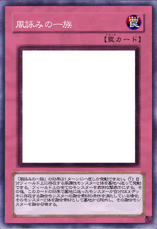 | 「風詠みの一族」の効果は1ターンに一度しか発動できない。①:自分フィールド上に存在する風属性モンスター2体を墓地へ送って発動できる。フィールド上の全てのモンスターを表側攻撃表示にする。その後、このカードの効果で墓地に送ったモンスターが自分のEXデッキに存在する融合モンスターの融合素材の条件を満たしている場合、そのモンスター2体を融合素材として墓地から除外し、その融合モンスターを融合召喚する。 | |||