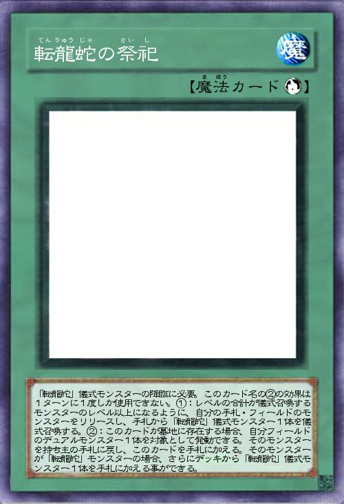 | 「転龍蛇」儀式モンスターの降臨に必要。このカード名の②の効果は1ターンに1度しか使用できない。①:レベルの合計が儀式召喚するモンスターのレベル以上になるように、自分の手札・フィールドのモンスターをリリースし、手札から「転龍蛇」儀式モンスター1体を儀式召喚する。②:このカードが墓地に存在する場合、自分フィールドのデュアルモンスター1体を対象として発動できる。そのモンスターを持ち主の手札に戻し、このカードを手札に加える。そのモンスターが「転龍蛇」モンスターの場合、さらにデッキから「転龍蛇」儀式モンスター1体を手札に加える事ができる。 | |||