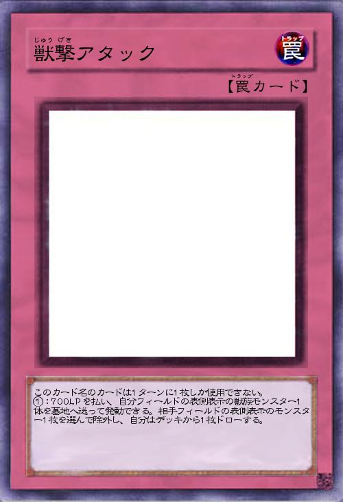 | このカード名のカードは1ターンに1枚しか使用できない。 ①:700LPを払い、自分フィールドの表側表示の獣族モンスター1体を墓地へ送って発動できる。相手フィールドの表側表示のモンスター1枚を選んで除外し、自分はデッキから1枚ドローする。 | |||