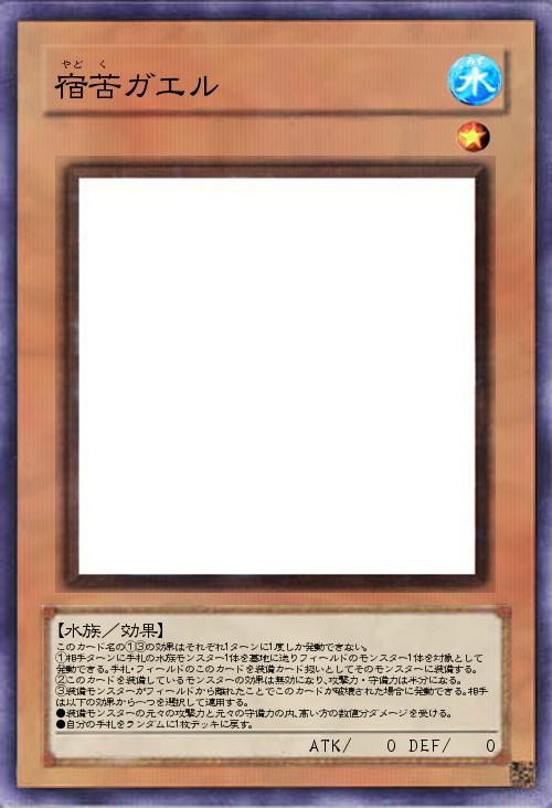 | このカード名の①③の効果はそれぞれ1ターンに1度しか発動できない。 ①相手ターンに手札の水族モンスター1体を墓地に送りフィールドのモンスター1体を対象として発動できる。手札・フィールドのこのカードを装備カード扱いとしてそのモンスターに装備する。 ②このカードを装備しているモンスターの効果は無効になり、攻撃力・守備力は半分になる。 ③装備モンスターがフィールドから離れたことでこのカードが破壊された場合に発動できる。相手は以下の効果から一つを選択して適用する。 ●装備モンスターの元々の攻撃力と元々の守備力の内、高い方の数値分ダメージを受ける。 ●自分の手札をランダムに1枚デッキに戻す。 | |||