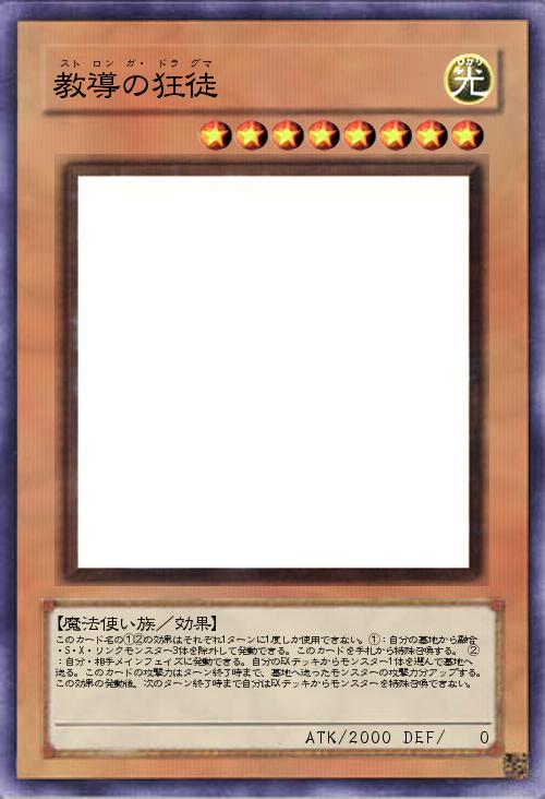 | このカード名の①②の効果はそれぞれ1ターンに1度しか使用できない。①:自分の墓地から融合・S・X・リンクモンスター3体を除外して発動できる。このカードを手札から特殊召喚する。 ②:自分・相手メインフェイズに発動できる。自分のEXデッキからモンスター1体を選んで墓地へ送る。このカードの攻撃力はターン終了時まで、墓地へ送ったモンスターの攻撃力分アップする。この効果の発動後、次のターン終了時まで自分はEXデッキからモンスターを特殊召喚できない。 | |||