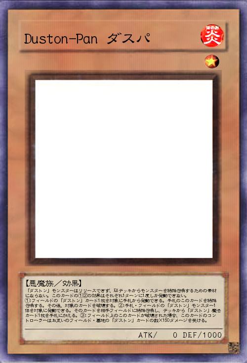 | 「ダストン」モンスターはリリースできず、EXデッキからモンスターを特殊召喚するための素材にならない。このカードの①②の効果はそれぞれ1ターンに1度しか発動できない。 ①:フィールドの「ダストン」カード1枚を対象に手札から発動できる。手札のこのカードを特殊召喚する。その後、対象のカードを破壊する。②:手札・フィールドの「ダストン」モンスター1体を対象に発動できる。そのカードを相手フィールドに特殊召喚し、デッキから「ダストン」魔法カード1枚を手札に加える。③:フィールド上のこのカードが破壊された場合、このカードのコントローラーはお互いのフィールド・墓地の「ダストン」カードの数×150ダメージを受ける。 | |||