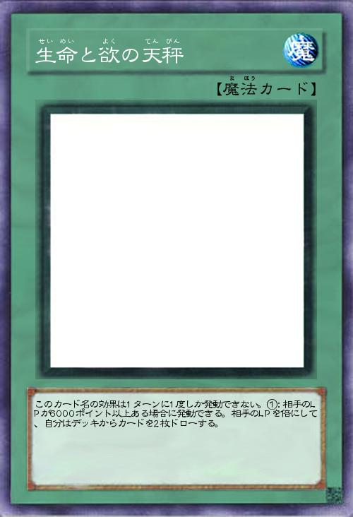 | このカード名の効果は1ターンに1度しか発動できない。①:相手のLPが6000ポイント以上ある場合に発動できる。相手のLPを倍にして、自分はデッキからカードを2枚ドローする。 | |||