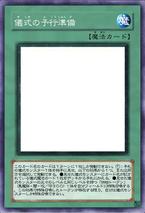 | このカード名のカードは1ターンに1枚しか発動できない。①:手札の儀式モンスター1体を相手に見せ、以下の効果から1つ、または両方を選択して発動できる。●見せた儀式モンスターにカード名が記されている儀式魔法カード1枚をデッキから手札に加える。●見せた儀式モンスターの元々のレベルと同じレベルを持つ「供物トークン」 (悪魔族・闇・攻/守300)1体を自分フィールドに特殊召喚する。この効果で特殊召喚したトークンが存在する限り、自分は儀式モンスターしか特殊召喚できない。 | |||